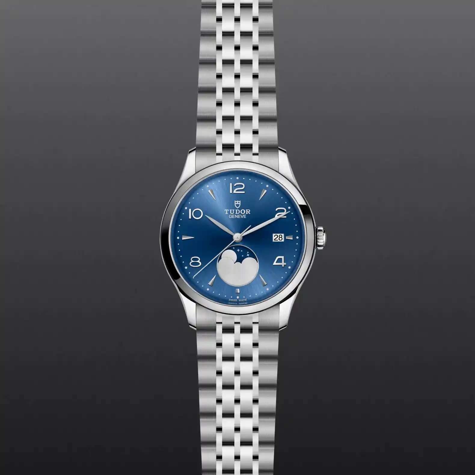 藍色錶面,飾以太陽放射紋,配立體鐘點標記及月相指示